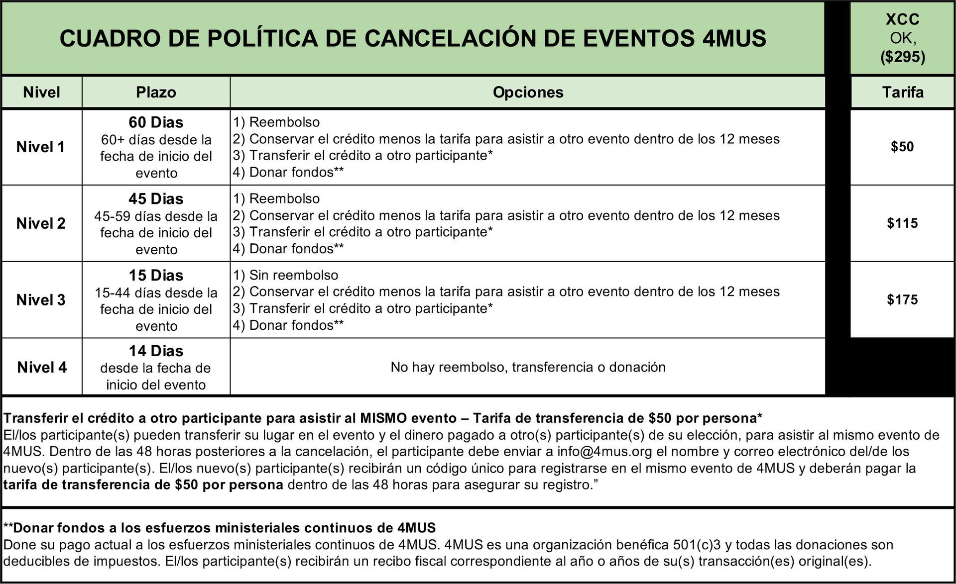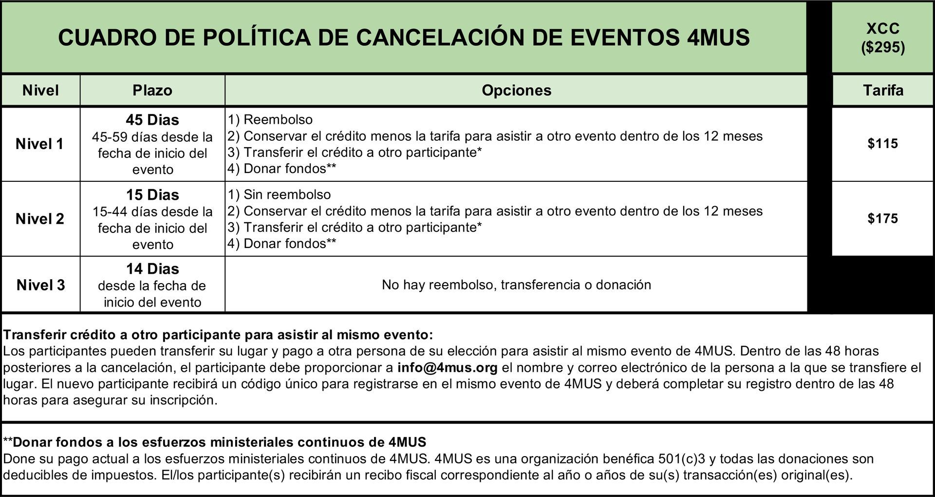 - Todas las cancelaciones DEBEN hacerse por escrito y enviarse por correo electrónico a info@4mus.org. No se aceptan cancelaciones por teléfono, a través de otros participantes ni por Telegram. Si 4MUS no recibe la notificación por correo electrónico antes del inicio del evento programado, se considerará que el participante no se presentó y no se realizarán reembolsos ni transferencias. El pago se destinará a las actividades ministeriales de 4MUS.